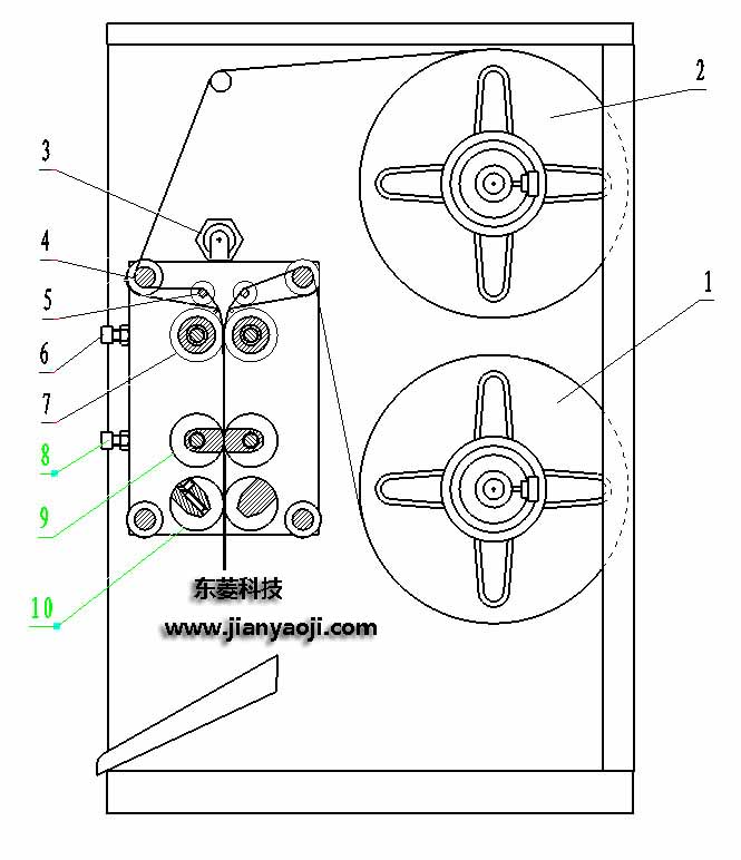 (2) 两卷PE卷分别装在上、下芯轴杆上。上卷按逆时针转动方向安装,下卷按顺时针转动方向安装;